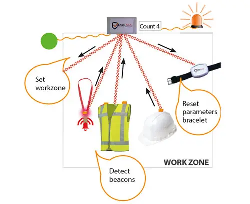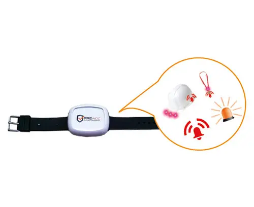PreAcc offers individual standardized systems for occupational health and safety. Workers wearing a PreAcc vibrating bracelet are alerted when they are too close proximity to other workers and do not keep the safe and necessary distance. The distance of the bracelet proximity alert is variable and automatically set depending on the work zone requirements.