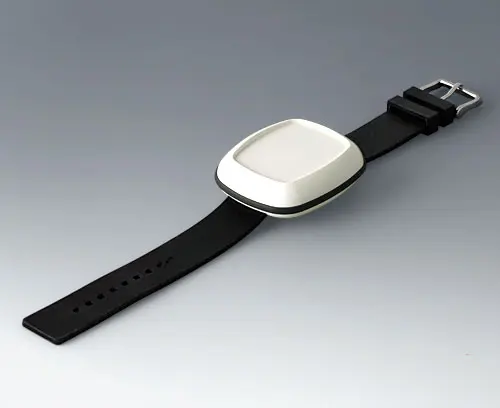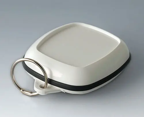 Modern small enclosure specifically designed for "wearable technologies". Three-part design consisting of highly polished top and bottom parts and a matt TPV sealing ring.