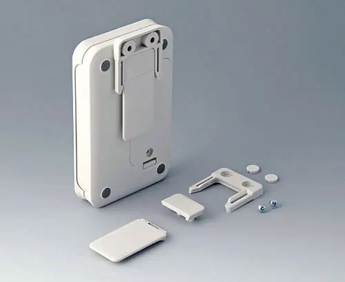Serves as a clip and / or wall suspension. Assembly oriented towards the length or width (size S towards the length only). For a battery exchange, the clip can easily be removed. Two mounting holes diameter 4.2 mm necessary.