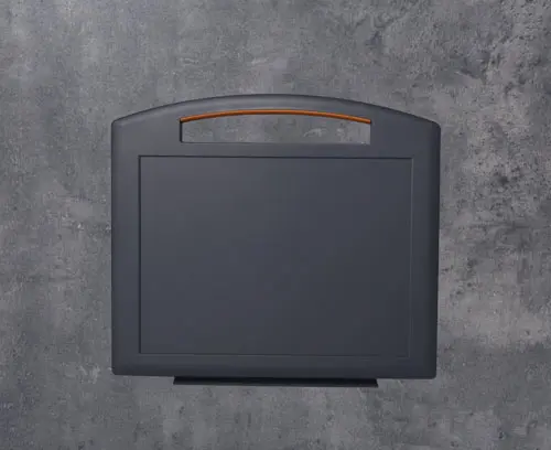 CARRYTEC L Particularly robust plastic enclosure with handle for outdoor use. Recessed surface for membrane keyboards. Flat, impact-protected areas on the bottom part of the enclosure for installing interfaces, plug-in connectors, peripheral equipment etc. Interface installation at the rear, e.g. support arm applications, ensures orderly cable routing through enclosure connection, mounting points match the hole patterns of VESA MIS-D 100. Attachment domes for PCBs and components in the top and bottom parts. Stations for easy transmission of data and charging current, as well as battery compartment 5 x AA (processing on request) as an accessory.