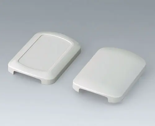 Basic enclosure, 2-piece, with convex and flattened shell. Recessed surface to protect the membrane keyboard, decor foil or label. Both end sides open, and end parts or the cable gland kits can optionally be mounted there (accessories). Four attachment domes for mounting a PCB in the flattened shell. Plastic enclosure snaps together.
