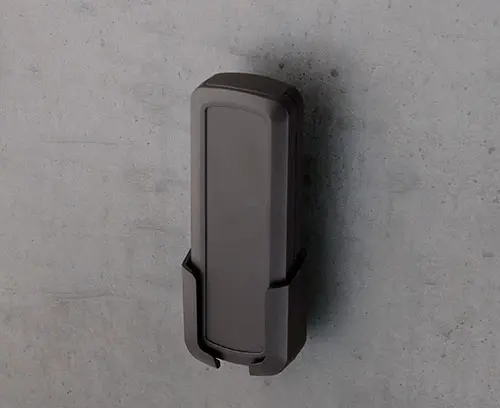 Special holder for CONNECT S for the secure storage of wired and wireless mobile devices. With large recess for plug-in connections. The holder is mounted on the wall or on other components with standard screws with head diameters of 5.5 to 7 mm.