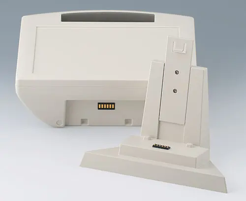 CARRYTEC S Robust plastic enclosure with handle. Recessed surface for membrane keyboards. Flat, impact-protected areas on the bottom part of the enclosure for installing interfaces, plug-in connectors, peripheral equipment etc. Interface installation at the rear, e.g. support arm applications, ensures orderly cable routing through enclosure connection. Attachment domes for PCBs and components in the top and bottom parts. Stations for easy transmission of data and charging current, as well as battery compartment 5 x AA (processing on request) as an accessory.