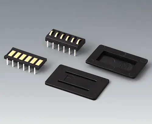 Universal accessories that simplify the assembly of contacts for transferring data and charging current between enclosures and stations. Available as a kit consisting of two plastic mounting plates for holding the 6-pin contacts which are available as accessories ("female" contact for the enclosure and "male" contact for the station).