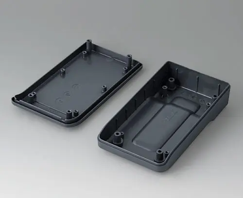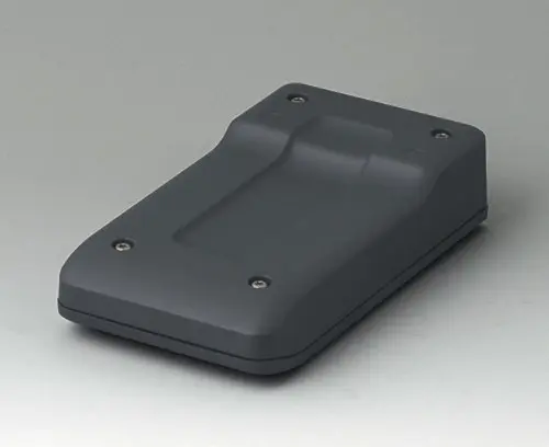 2-part compact hand-held enclosure with an ergonomic, robust design. Secure grip through finger recess in the bottom part. Recessed user area to protect the operating elements. Attachment domes for PCBs and components in the top and bottom parts.