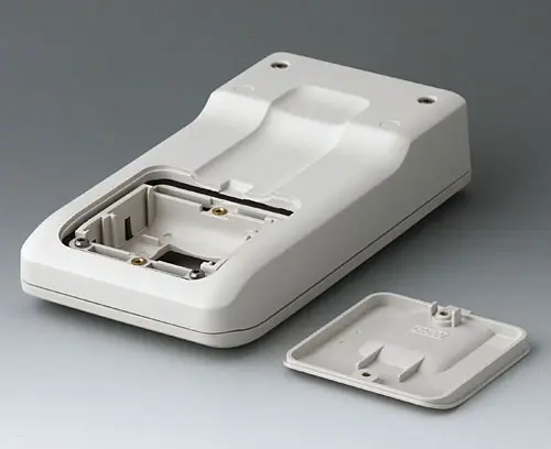 3-part compact hand-held enclosure with sealing and with an ergonomic, robust design. Ideal for miniaturised electronics applications. Secure grip through finger recess in the bottom part and centre of gravity near the body. With a battery compartment, accessible from the outside, for 3 x 1.5 V AA batteries. Recessed user area to protect the operating elements. Attachment domes for PCBs and components in the top and bottom parts.