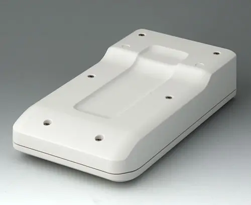 2-part compact hand-held enclosure with sealing and with an ergonomic, robust design. Secure grip through finger recess in the bottom part. Recessed user area to protect the operating elements. Attachment domes for PCBs and components in the top and bottom parts.