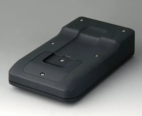 3-part compact hand-held enclosure with sealing and with an ergonomic, robust design. Ideal for miniaturised electronics applications. Secure grip through finger recess in the bottom part and centre of gravity near the body. With a battery compartment, accessible from the outside, for 3 x 1.5 V AA batteries. Recessed user area to protect the operating elements. Attachment domes for PCBs and components in the top and bottom parts.