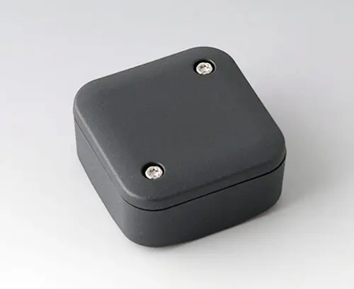 2-part plastic enclosure with high top part, for universal use. Robust design with proven tongue and groove connection. Assembled with Torx stainless steel screws. Fixing supports for PCBs and components in the top and bottom parts. Fastening on the supports is by means of hot caulking.