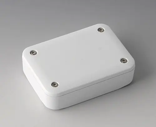 2-part plastic enclosure with high top part, for universal use. Robust design with proven tongue and groove connection. Assembled with Torx stainless steel screws. Fixing supports for PCBs and components in the top and bottom parts. Fastening on the supports is by means of hot caulking.