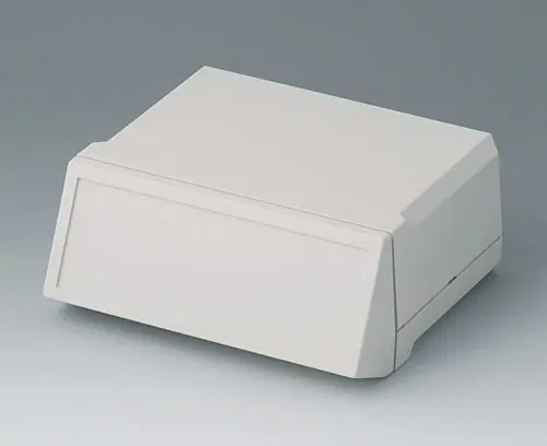 MOTEC S, flat/high Desk top case with flat base and high top part. Screwless mounting of the shells. Front and rear part open. Screw towers for PCBs and vertical guides for mounting panels. Front and rear panels to slide in as accessory.