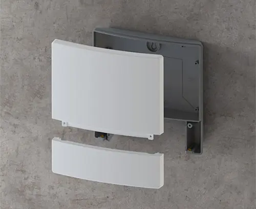 Three-part enclosure with a uniform appearance thanks to concealed screw connections. Modern colour combination of light grey and lava. 2 PCB levels with 4 attachment domes each in the electronics compartment. Can also be used out of doors thanks to the high-quality ASA+PC-FR material.
