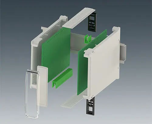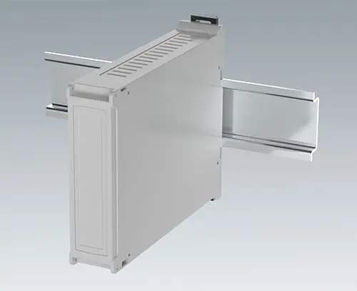 DIN rail enclosure with 2 pluggable side panels with ventilation slots for increased heat dissipation and front panel. Simple and quick assembly by locking onto DIN rails EN 60715 TH35. The panel version provides simple and flexible installation of the electronics as well as efficient, screwless case assembly.
