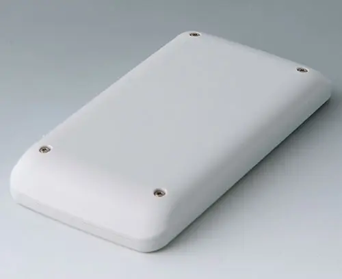 2-piece handheld enclosure, flat design, with a large operating panel of up to 4" (10 cm). The contours of the enclosure are rounded along the sides - comfortable to hold and easy to operate. Recessed operating panel for using a contoured transparent front screen (available as an accessory with adhesive film) or for protecting individual membrane keyboards. Fastening pillars for mounting PCBs in top and bottom parts. Seal for protection class IP 65 available as accessory.