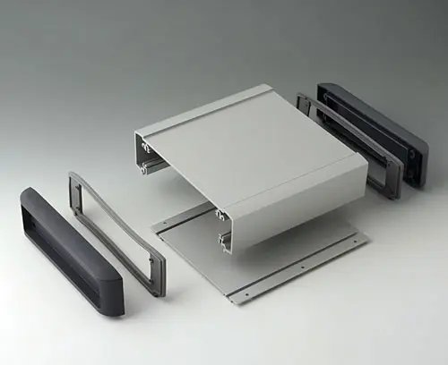 Horizontal guides and screw channels provided inside the case for fitting PCBs. Flat areas for easy installation of interfaces. Recessed area in the top for the protection of displays, membrane keypads and operating elements. Side covers with recessed area for protecting cables and connectors.