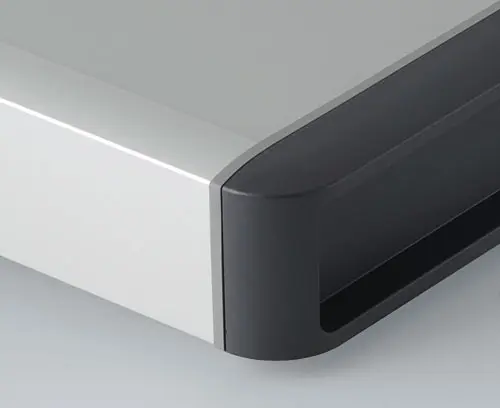 Rational assembly – no additional screw connection needed: when the enclosure is being assembled, the case canting mouldings are pushed into the base profile and automatically fixed by the side covers.