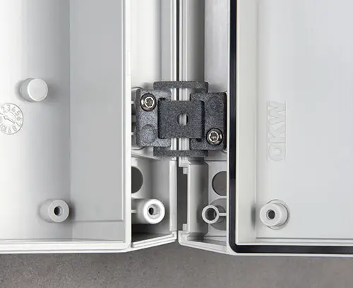 Additively manufactured hinge for holding the top part when opening the enclosure.