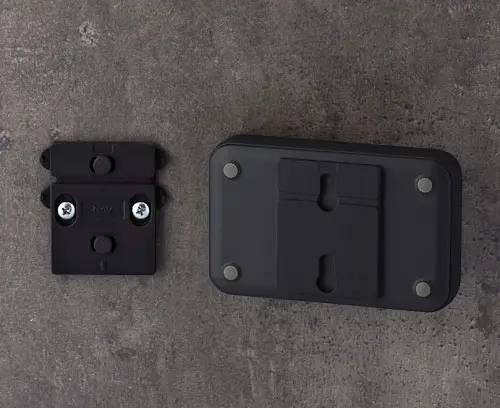 The adapter (45 x 58 mm) is attached to the enclosure with a double-sided adhesive foil*. This makes it possible to mount the enclosure quickly and easily on the holder, which can be screwed to the wall - attachment with adhesive foils* is optionally also possible here (separate article available as an accessory). Removal protection by means of a locking pin.