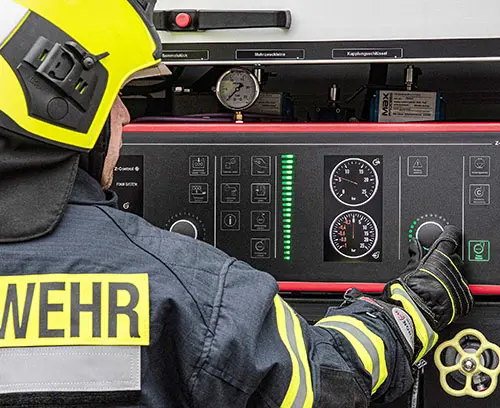 The Z-Control pump control station includes, among other things, the illuminated STAR-KNOBS from OKW. The control panel enables glove-friendly and intuitive operation, through which all discharge functions can be executed at the push of a button. In addition, Z-Control provides an overview of the work processes, the operating status, the water and foam concentrate flow rate as well as the proportioning rate. Through light colour and light animation safe operation is possible: only the functions that can be activated will be visible on the interface.