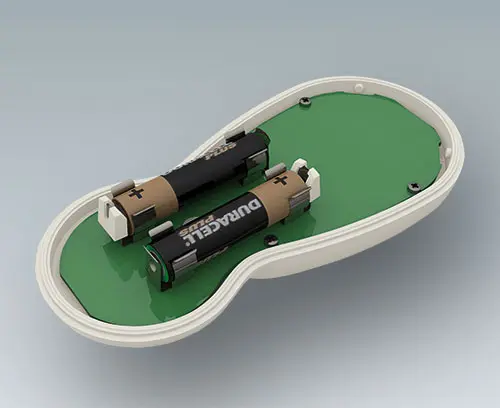 BLOB UNIT A genuine hand held enclosure that can be held and operated with one hand. Two-part enclosure design. Recessed surface for membrane keyboards. Attachment domes for a PCB in the top part.