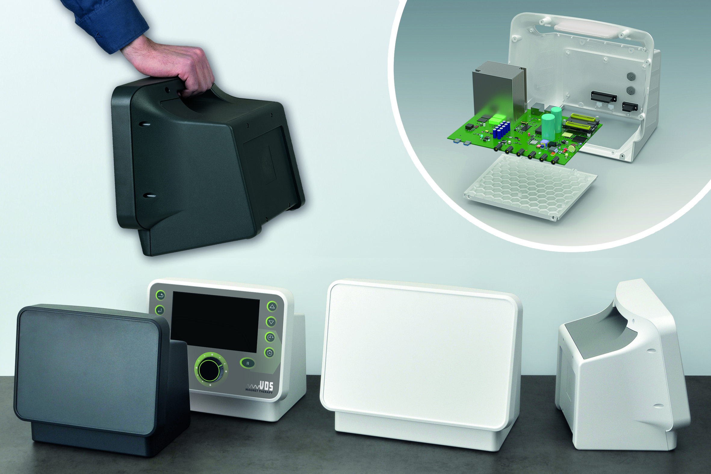 OKW’s new COMMUNITEC enclosure series provides a contemporary, high-capacity solution for large and heavy-duty electronic installations. With an ergonomically inclined operating surface of 12°, the table-top enclosure is ideal for displays from 11,5" to 14". An integrated handle facilitates transport – particularly practical for mobile applications in medical technology, such as patient monitoring, ventilation or neuromonitoring devices. COMMUNITEC also has a wide range of applications in aesthetic medicine as well as in laboratory, environmental and automation technology.