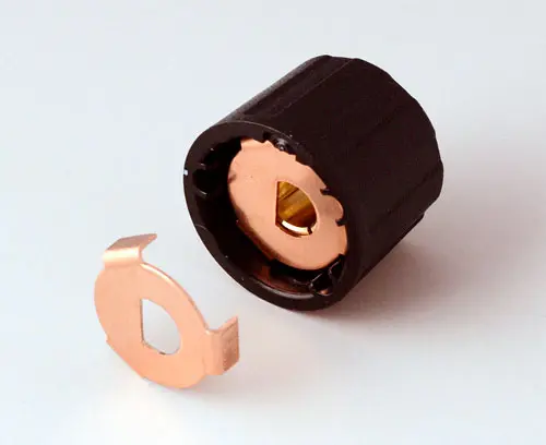 ROUND KNOB 31, without line Suitable for rotary potentiometer with round shaft ends according to DIN 41591. Collet system for convenient knob assembly from the front and simple adjustment (with adjustment key - sep. article). Continuous center hole.