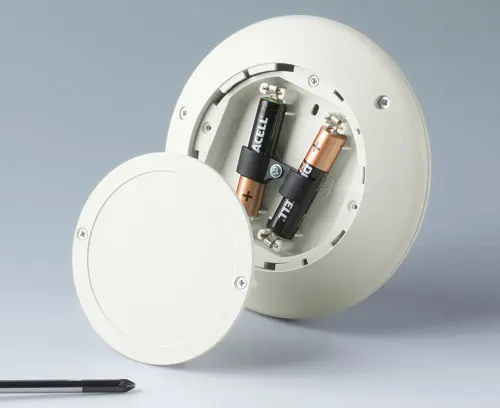 Assembly unit: With bayonet lock, snapping into place. If required securing using 2 screws. Screw pillars for PCBs in bottom and top part. Screw pillars for battery compartment (acc.) in bottom part. End piece (lid / battery compartment lid / base) required for bottom part - see separate article.