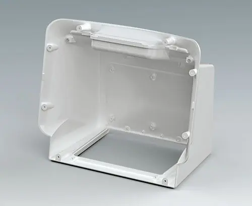 Order with COMMUNITEC S basic housing. Features a recessed area for protecting membrane keypads and integrating large-format displays up to 11.5" (29 cm), with a flat area below for front-mounted control elements and connectors. Includes integrated fastening pillars for PCBs or mounting plates. The operating panel is installed from the rear.