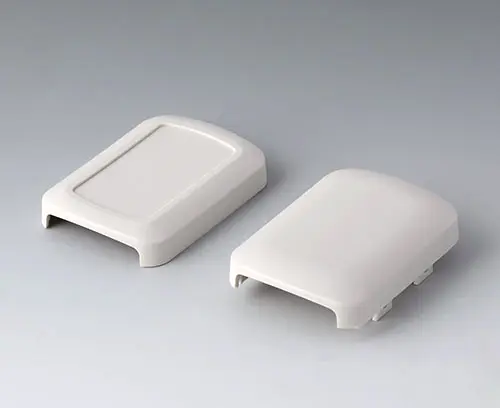 Basic enclosure, 2-piece, with convex and flattened shell. Recessed surface to protect the membrane keyboard, decor foil or label. Both end sides open, and end parts or the cable gland kits can optionally be mounted there (accessories). Four attachment domes for mounting a PCB in the flattened shell. Plastic enclosure snaps together.