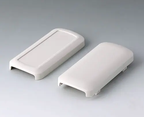 Basic enclosure, 2-piece, with convex and flattened shell. Recessed surface to protect the membrane keyboard, decor foil or label. Both end sides open, and end parts or the cable gland kits can optionally be mounted there (accessories). Four attachment domes for mounting a PCB in the flattened shell. Plastic enclosure snaps together.