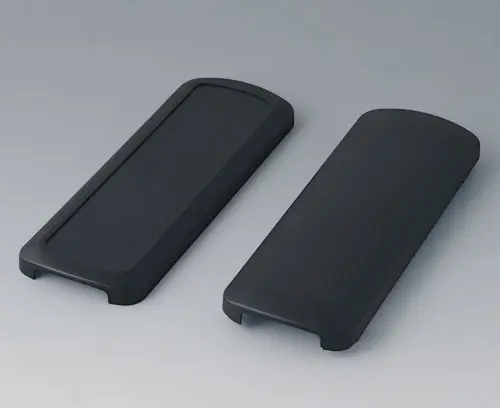 Basic enclosure, 2-piece, with convex and flattened shell. Recessed surface to protect the membrane keyboard, decor foil or label. Both end sides open, and end parts or the cable gland kits can optionally be mounted there (accessories). Four attachment domes for mounting a PCB in the flattened shell. Plastic enclosure snaps together.