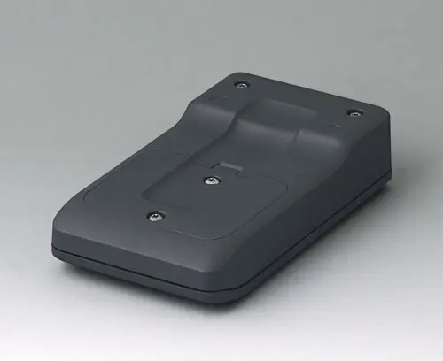 3-part compact hand-held enclosure with sealing and with an ergonomic, robust design. Ideal for miniaturised electronics applications. Secure grip through finger recess in the bottom part and centre of gravity near the body. With a battery compartment, accessible from the outside, for 3 x 1.5 V AAA batteries. Recessed user area to protect the operating elements. Attachment domes for PCBs and components in the top and bottom parts.