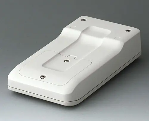 3-part compact hand-held enclosure with sealing and with an ergonomic, robust design. Ideal for miniaturised electronics applications. Secure grip through finger recess in the bottom part and centre of gravity near the body. With a battery compartment, accessible from the outside, for 3 x 1.5 V AA batteries. Recessed user area to protect the operating elements. Attachment domes for PCBs and components in the top and bottom parts.