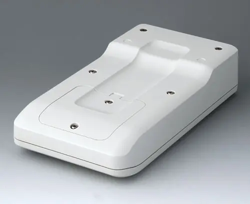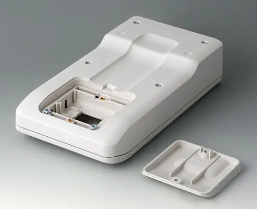 3-part compact hand-held enclosure with an ergonomic, robust design. Ideal for miniaturised electronics applications. Secure grip through finger recess in the bottom part and centre of gravity near the body. With a battery compartment, accessible from the outside, for 3 x 1.5 V AA batteries. Recessed user area to protect the operating elements. Attachment domes for PCBs and components in the top and bottom parts.