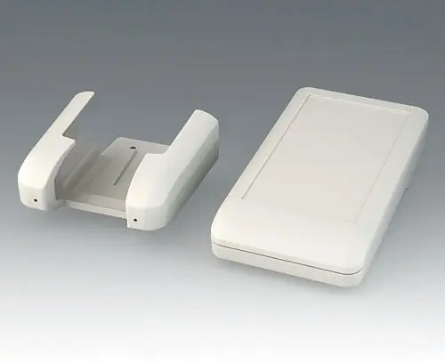 DATEC-COMPACT L 2-part compact hand-held enclosure with an ergonomic, robust design. Secure grip through finger recess in the bottom part. Recessed user area to protect the operating elements. Attachment domes for PCBs and components in the top and bottom parts.