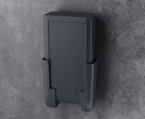 Special holder for DATEC-COMPACT L for the secure storage of wired and wireless mobile devices. With large recess for plug-in connections. The holder is mounted on the wall or on other components with standard screws with head diameters of 5.5 to 7 mm.