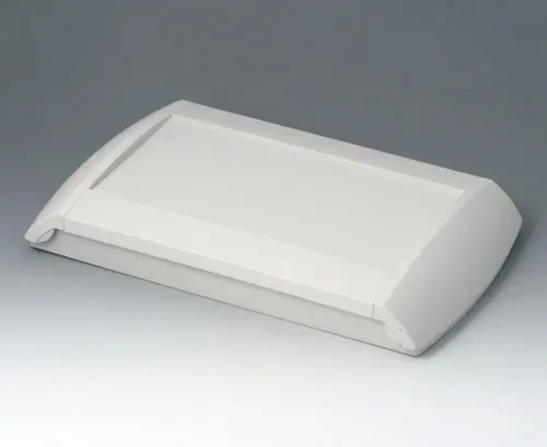 Four-part case. The bottom part can be fixed directly to the wall, the top part will be assembled by means of screws from the front. 2 side trims close the case. If required, the trims can also be locked, thus preventing unauthorised access. Recessed operating area to protect the membrane keyboard. Fastening pillars in the bottom and top part. Integrated battery compartment for 2 x AA / 1 x 9 V. If required the hinged lid S can be mounted either on the right or on the left to partially cover the dialog area (on one side).