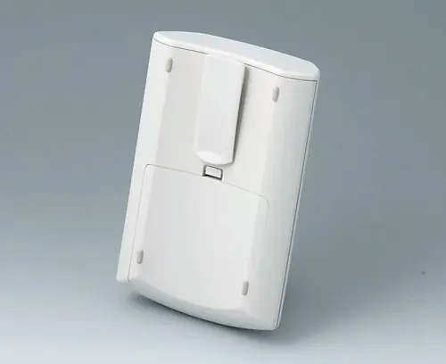 ERGO-CASE M, high Ergonomically shaped enclosure to wear on the body. Recessed operating area in order to protect the membrane keyboards. Plane area for individual interfaces at the end side. Battery compartment lid snapped-on (battery compartment as accessory).