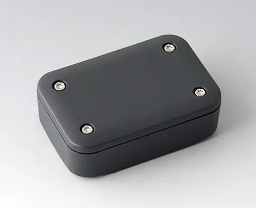 2-part plastic enclosure with high top part, for universal use. Robust design with proven tongue and groove connection. Assembled with Torx stainless steel screws. Fixing supports for PCBs and components in the top and bottom parts. Fastening on the supports is by means of hot caulking.