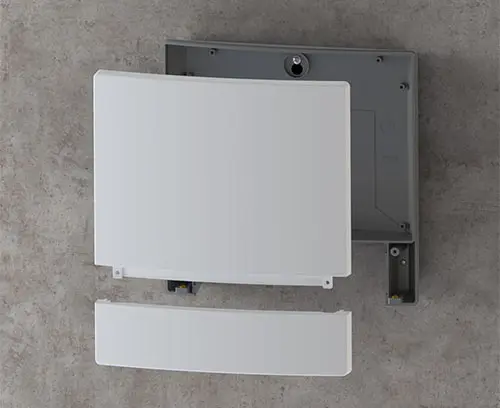 Bottom part with openings for concealed three-point wall mounting: 1 keyhole for central mounting and 2 holes to secure the enclosure on the bottom right and left.