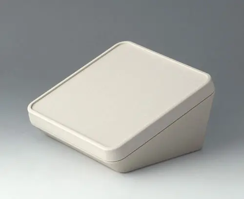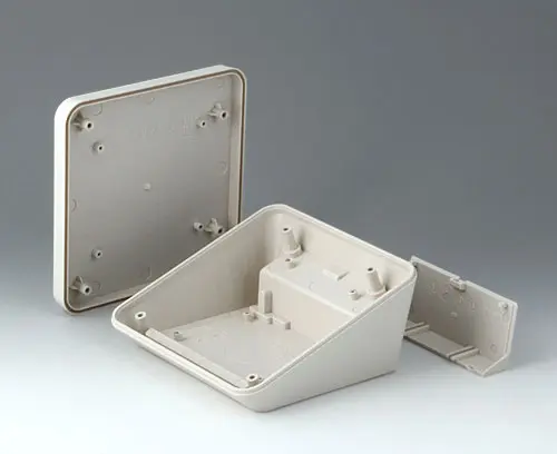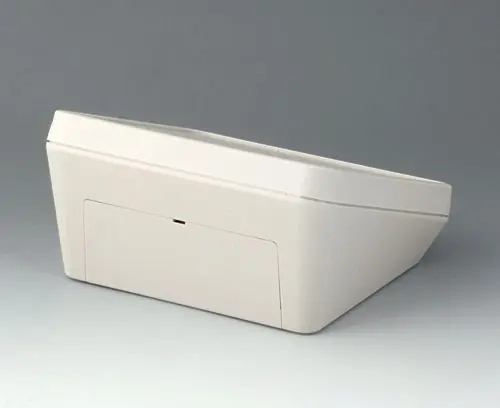 Modern three piece plastic enclosure with an ergonomically inclined operating panel. The snap-on cover included in the supply makes it possible to close the deep recessed interface area at the rear both visually and/or to install additional electronics in a separate area. Fastening pillars for PCBs and components in the top and bottom parts. Wall suspension element and sealing (to raise the protection class up to IP 65) included in the range of accessories. Hidden stainless steel assembly screws with secure Torx heads. Can also be used outdoors thanks to the high-quality material and the robust design.