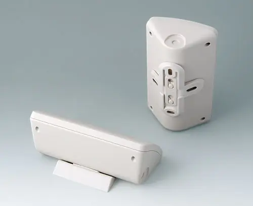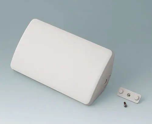 Two-part plastic enclosure with convex, curved top part. The basic triangular shape allows it to be used in corners or at an ergonomically favourable angle of 45°. Robust design with proven tongue and groove assembly. Case assembled with Torx drive stainless steel screws. Protection class IP 40 without optional sealing kit. Fastening pillars for PCBs and components in the top and bottom parts.