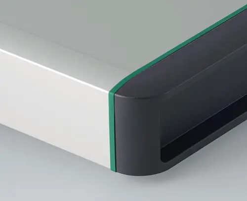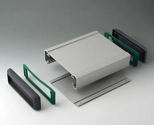 Horizontal guides and screw channels provided inside the case for fitting PCBs. Flat areas for easy installation of interfaces. Recessed area in the top for the protection of displays, membrane keypads and operating elements. Side covers with recessed area for protecting cables and connectors.