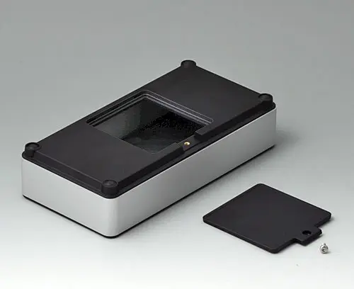 4-part enclosure for many different applications. Sturdy frame made of aluminium, glass bead-blasted and anodised. Plastic parts made of ASA+PC-FR with good UV resistance and high flame resistance. Attachment domes for PCBs and components in the top and bottom parts. Top part with recessed surface to protect the membrane keyboard. Bottom part with opening and screw-down cover: practical for the use of a battery compartment or for access to the interior, e.g. for a memory card or batteries that are mounted directly on the PCB. Battery compartment kit 4 x AA with contact springs, battery clips, button cell holder and wall mounting option as accessories.