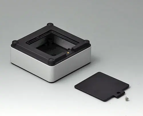 4-part enclosure for many different applications. Sturdy frame made of aluminium, glass bead-blasted and anodised. Plastic parts made of ASA+PC-FR with good UV resistance and high flame resistance. Attachment domes for PCBs and components in the top and bottom parts. Top part with recessed surface to protect the membrane keyboard. Bottom part with opening and screw-down cover: practical for the use of a battery compartment or for access to the interior, e.g. for a memory card or batteries that are mounted directly on the PCB. Battery compartment kit 4 x AA with contact springs, battery clips, button cell holder and wall mounting option as accessories.